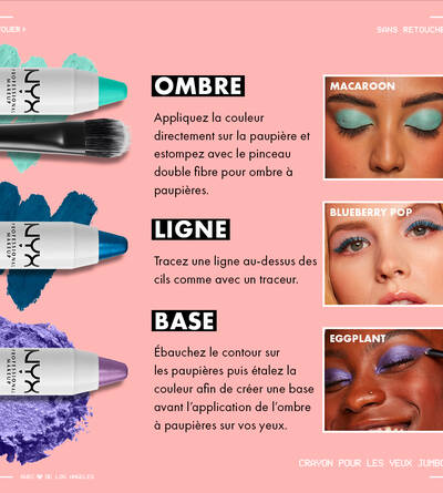 Appliquez le crayon géant pour les yeux Jumbo de NYX Professional Makeup comme un ligneur, par-dessus toute la paupière comme une ombre à paupières unique, ou sous l’ombre à paupières comme une base. Peut être aiguisé!