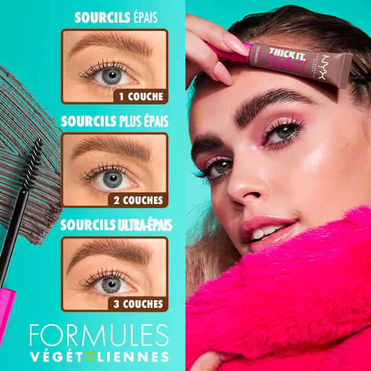 Les fibres d’origine végétale teintées et hautement modulables rehaussent les sourcils d’un cran à chaque couche.